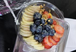 After waiting for about seven minutes, the bowl came out on a tray with utensils. The wait didn’t seem as long as it did due to the nice music, relaxing atmosphere, and since we had each other’s company. The presentation was very intricate and beautiful, and the portions were very large, explaining the price. Taking a bite, the taste of fresh fruit blended perfectly with the acai, and the texture of the soft fruit, crunchy granola, and smooth acai worked perfectly together. The coconut flakes also acted as a bridge between all the different ingredients, and their soft, yet crunchy texture helped tie the bowl together.